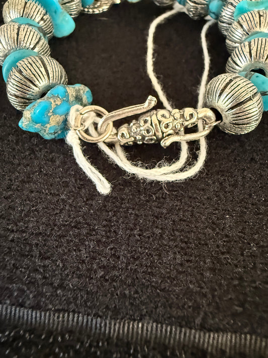 Silver and Turquoise 8 Inch Hand Beaded Bracelet One‑of‑a‑Kind