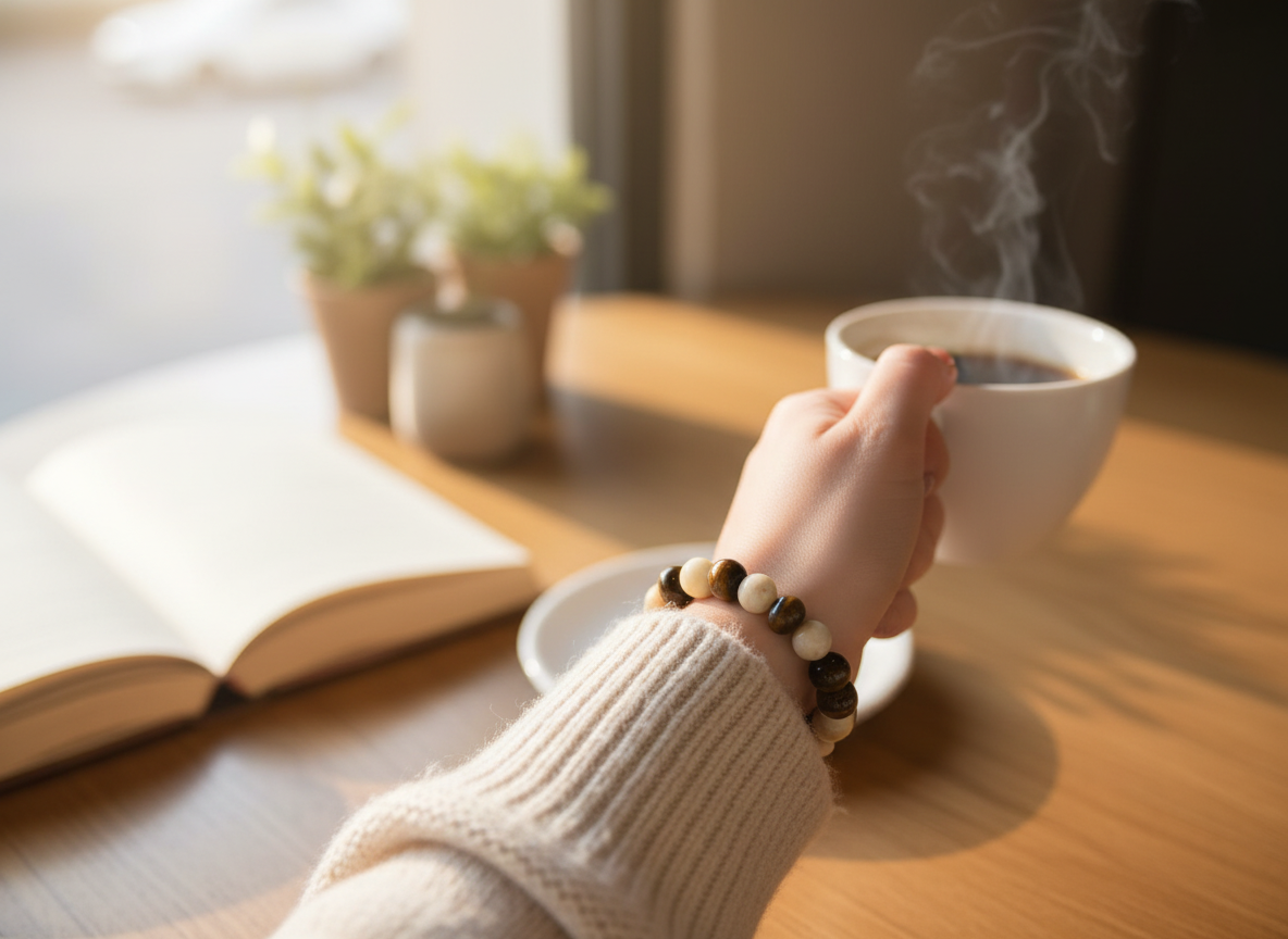 Handcrafted 7" Elastic Beaded Bracelet – Cream & Brown Gemstone‑Style Beads – Stretch Boho Bracelet for Everyday Wear & Gift Giving